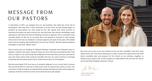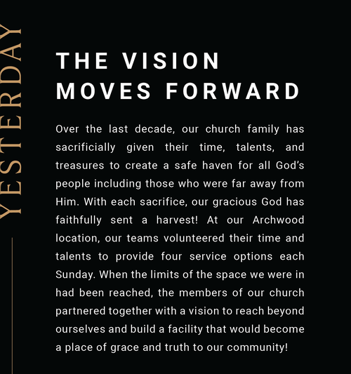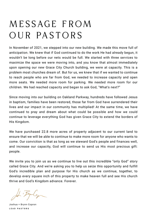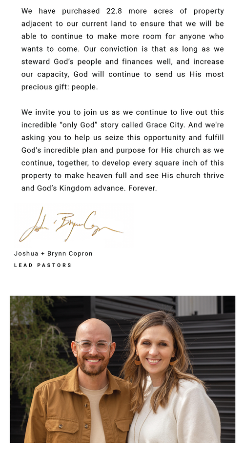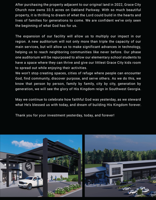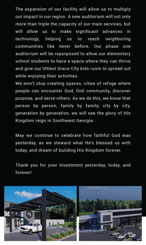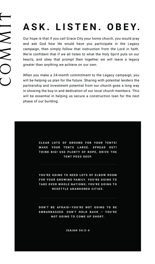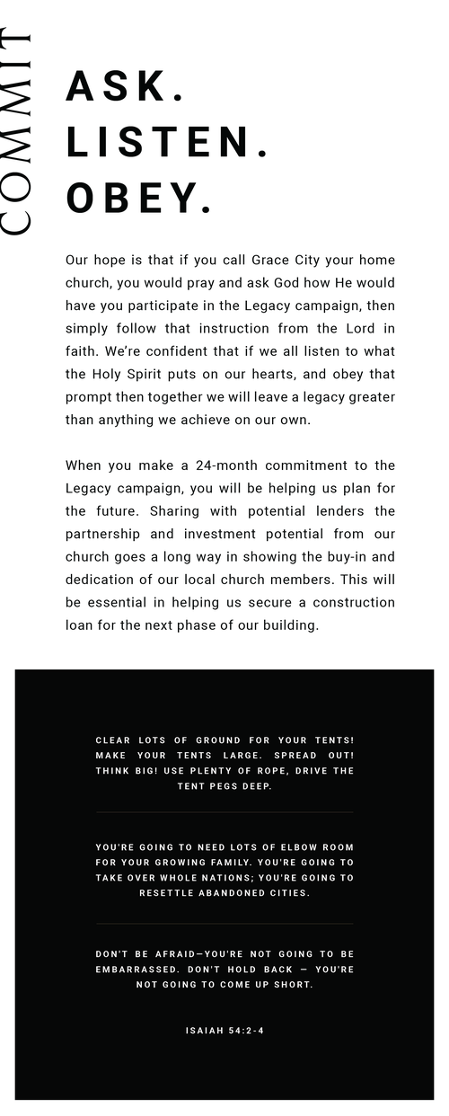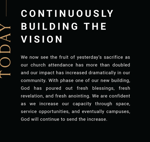 We’re asking you to prayerfully consider a sacrificial 24-month commitment toward the LEGACY CAMPAIGN. Ask God to show you what He would have you give above and beyond your normal tithe.